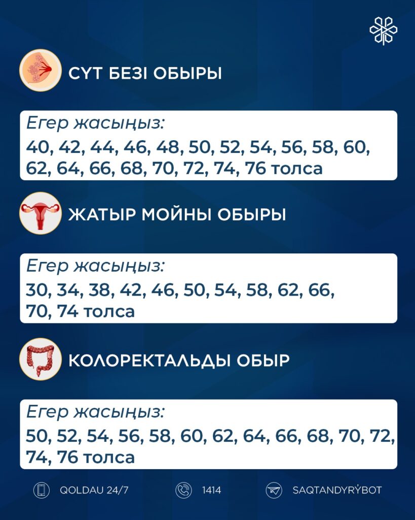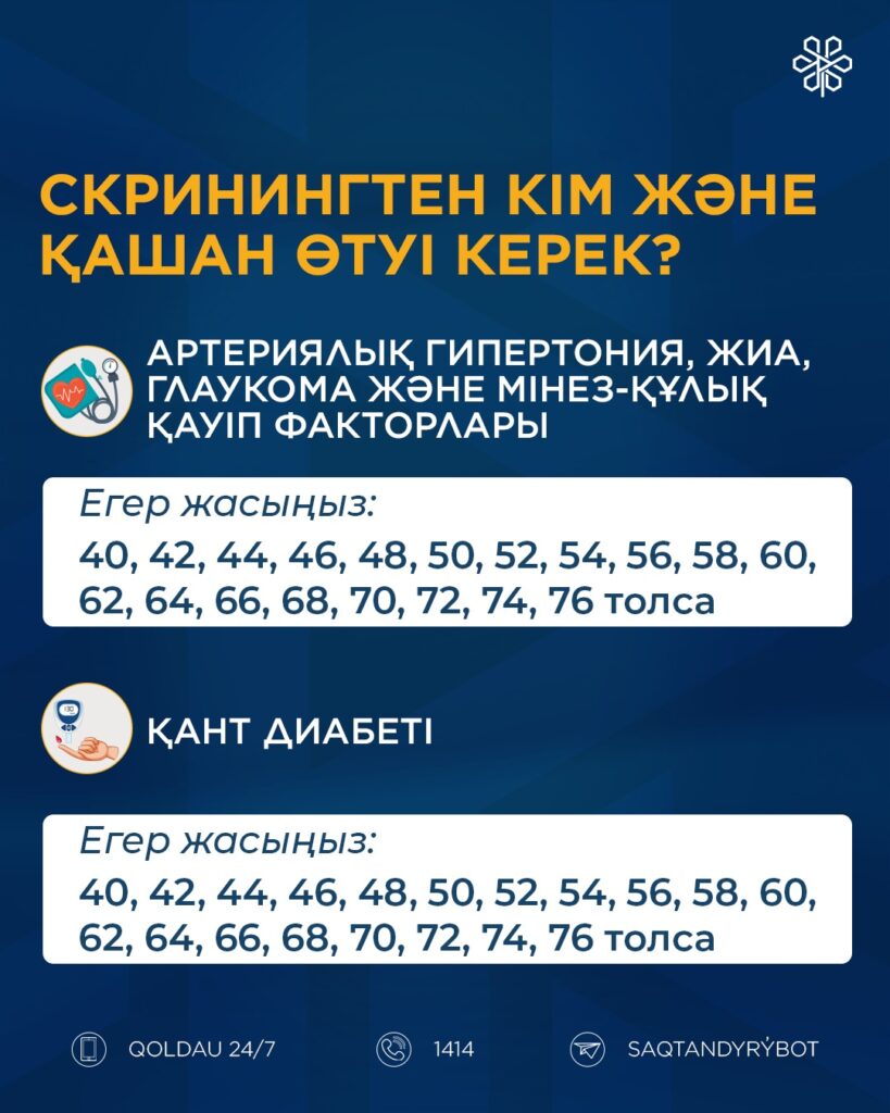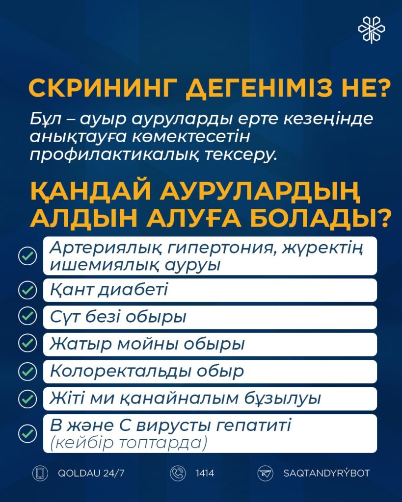 Қазақстанның әрбір азаматы денсаулығына ешқандай шағымы болмаса да, профилактикалық тексерулер мен скринингтерден уақтылы өтіп отыруы тиіс.